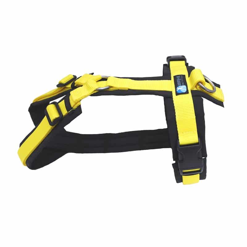Das gepolsterte (vollunterlegte) Geschirr Fun ist im Hals- und Brustbereich individuell einstellbar und zwei Steckschnallen sorgen für einen bequemen Einstieg. Das Geschirr ist so aufgebaut, dass es sich dem Körperbau des Hundes ergonomisch anpasst, dadurch entsteht eine optimale Zugverteilung, die den Rücken Ihres Hundes schont. Voraussetzung hierfür ist, dass die Leine ausschließlich an dem dafür vorgesehenen Leinenring eingehakt wird. Wir raten grundsätzlich davon ab den Karabiner der Leine an einem der anderen, vorderen Ringe einzuhaken, da sich das Geschirr verzieht und das Gurtband einem erhöhten Verschleiß unterliegt. Die umlaufenden Gurte im Brustbereich bilden dank des langen Unterbruststegs einen bewegungsfreundlichen Abstand zu den Vorderbeinen, so dass die Achseln geschont werden. Das Gurtband ist in der kleinsten Einstellung komplett mit luftdurchlässigen Schaumstoff gepolstert und dieser wiederum ist mit Cordura (hoch abriebfestes Material) eingefasst.